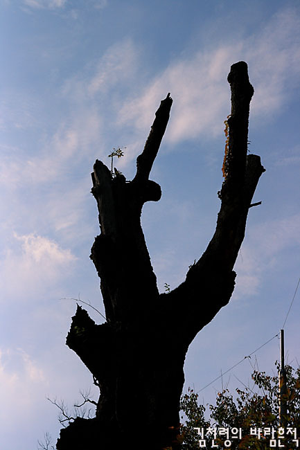 이 예쁜 산중 정원에 들어서면 고목나무 한 그루가 손님을 맞이한다. 장엄한 지리능선과 오랜 세월을 함께 했으리라. 고목나무 위에는 아직도 새 순이 돋아나 있어 끈질긴 생명력을 드러내고 있다. 담쟁이가 다 죽은 나무를 휘감은 채 생명력을 불어 넣고 있다.
