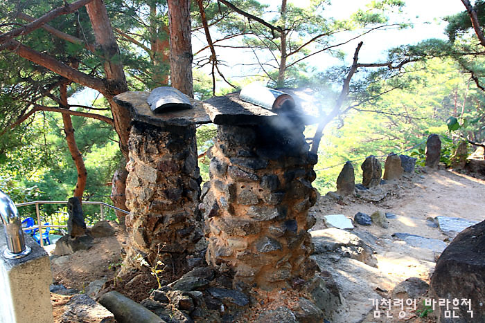 연못으로 가는 길에 굴뚝 두 개가 연기룰 품어내고 있었다. 자연의 흙과 돌로 얼기설기 만들었나 보다.