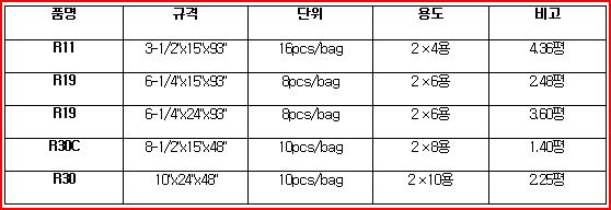 다음은 인슐레이션 종류와 규격입니다. (R 값이 높은 것이 단열성능이 높습니다.)