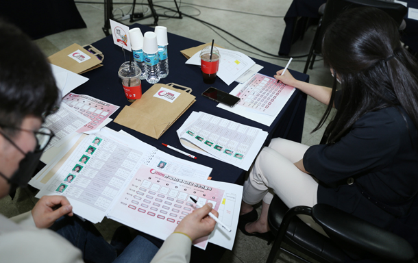 ▲ 사전지명을 하지 않은 다섯 팀 감독들이 드래프트 순번을 놓고 추첨하고 있다.