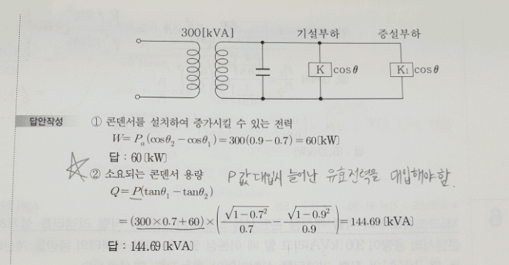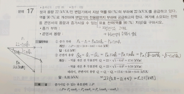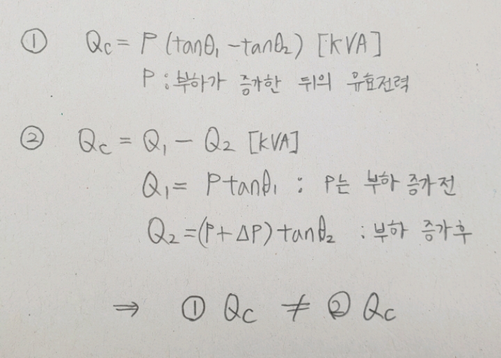 질문 : 전력용 콘덴서의 용량을 이렇게 계산해도 되는 건가요? (역률 개선 전 무효전력-역률 개선 후 무효전력)이라면 역률 개선 전 무효전력은 늘어난 유효전력을 고려하지 않은 값이 아닌가요?