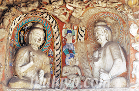 | 사진설명: 운강석굴의 이불병좌상. 다보여래와 석가여래가 함께 앉아 있는 이 모습은 운강석굴에 특히 많다. |
