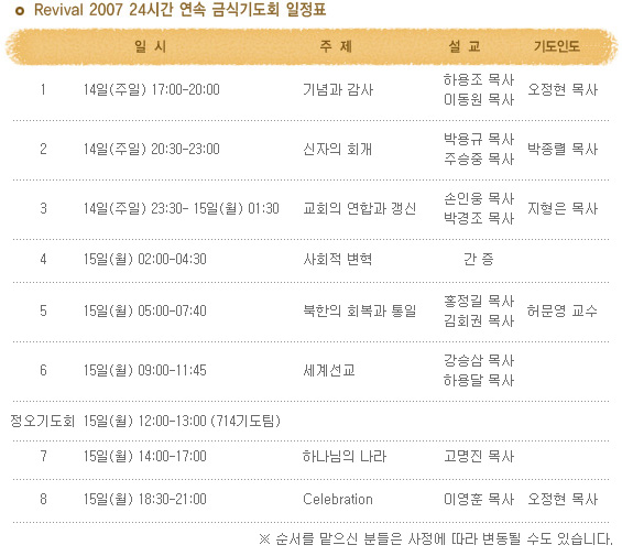 이번에 열린 ‘Transformation 2007’대회는, 먼저 1월 4일부터 6일까지 에스더 기도운동본부 주관으로 오산리최자실금식기도원에서 있었던 “7,000명 에스더 단식 구국성회”에 이어 진행된 것으로, 13일 오후 1시부터 14일 새벽 1시까지 열리는 “The Call” 12시간 금식기도회를 끝으로 마무리된다. 곧이어, 14일 오후 5시부터 15일 오후 10시까지 같은 장소에서 교단과 교파를 초월한 교회와 성도들이 이 민족을 복음으로 새롭게 하실 것을 간구하며 “역사를 이루는 기도-Revival 2007 28시간 연속 금식기도회”로 모일 예정이다.