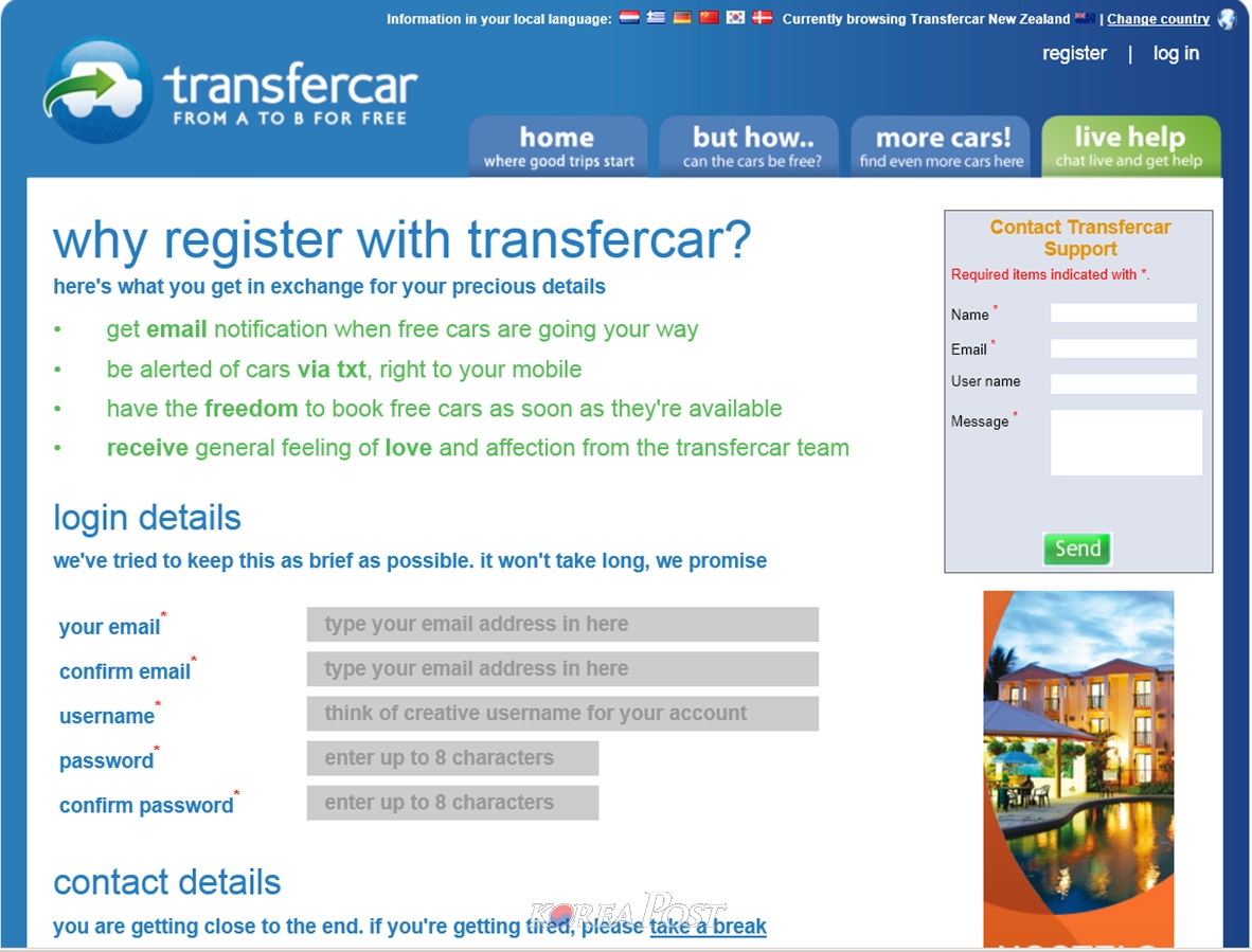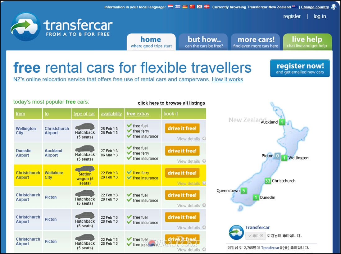 한국에서도 회원 가입(Resister)은 가능하고 필수 조건인 운전 면허는 뉴질랜드 면허를 비롯해 뉴질랜드에서 운전할 수 있는 국제 면허증으로도 됩니다.