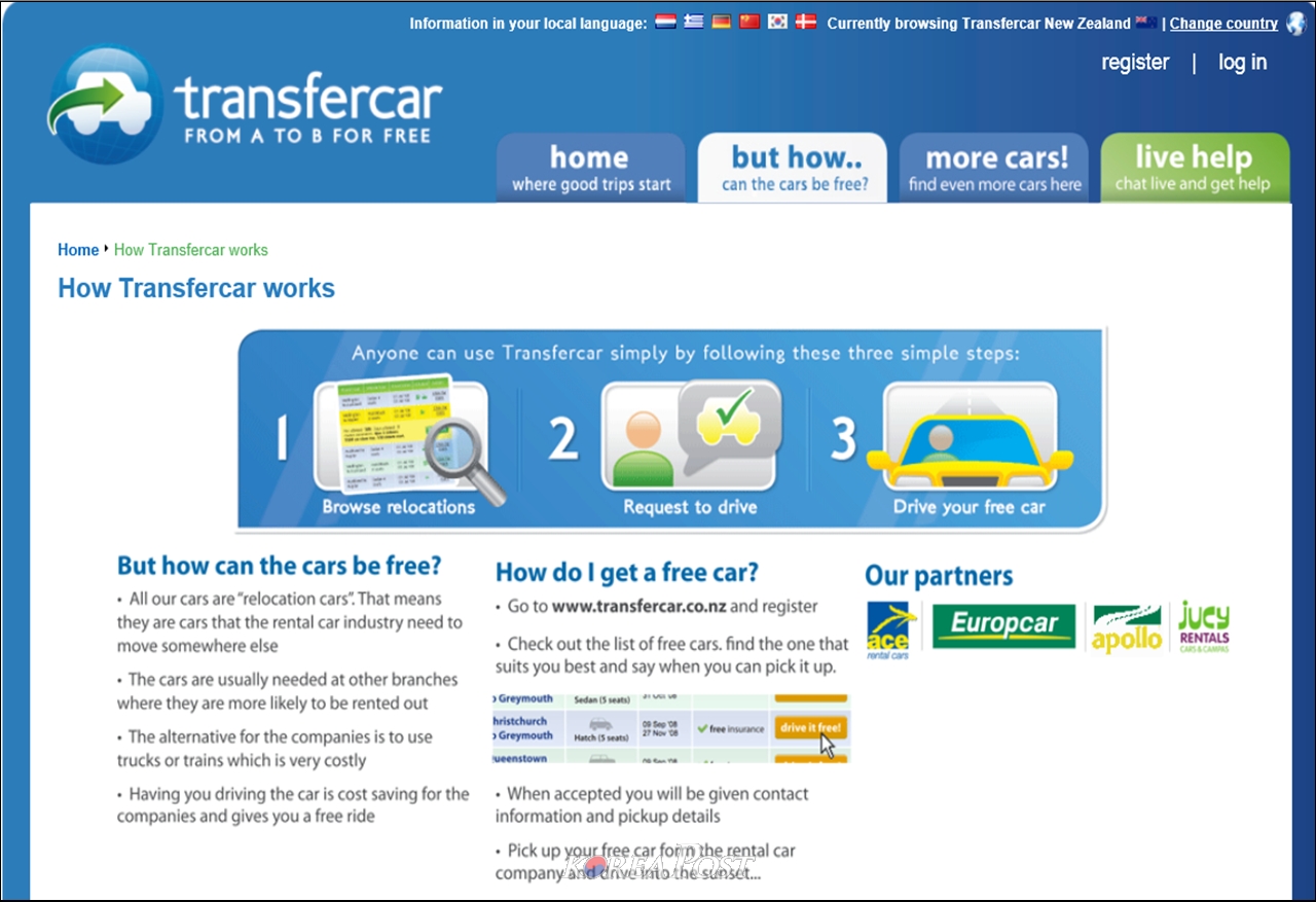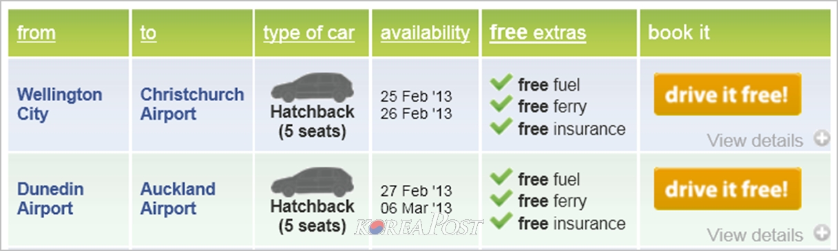 이렇게 무료 렌탈카 이용이 가능한 것은 뉴질랜드 전역의 렌탈카 회사(주로 오클랜드, 크라이스트처치, 퀸즈타운,더니든,픽톤 등에 위치해 있음)에서 차를 빌린 외국인이나 여행객이 여행을 마친 후, 비행기를 타고 떠나면서 빌린 차를 공항 주차장에 반환한 것을 각 회사에서 각자의 회사 차고지에 차를 가져오는 것에 다른 인력을 쓰지 않고 무료 렌탈을 통해 차를 회수하는 시스템을 활용하기 때문입니다.