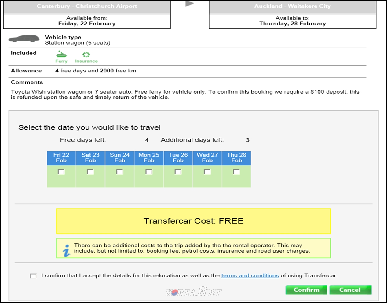 선택한 차량의 사용 날짜와 조건 등을 살펴본 후 최종 결정을 하기 위해 Confirm 버튼을 누르면 TransferCar 사이트에는 대기 중으로 나타납니다. 그리고, 회원가입할 때 기입한 메일을 통해 관련 내용이 전송되며, 해당 차를 이용할 수 있다는 승인이 떨어지면 그 차를 빌릴 수 있는 렌탈카 회사명과 픽업할 주소,전화번호 등을 메일로 보내줍니다.