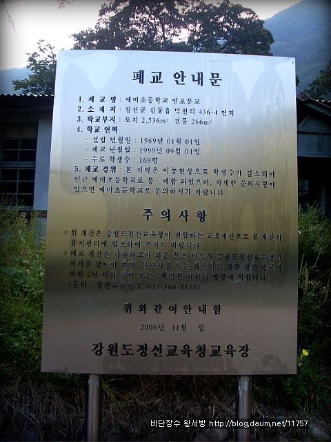 예미초등학교 연포분교장 폐교 안내문 - 강원도 정선군 신동읍 덕천리