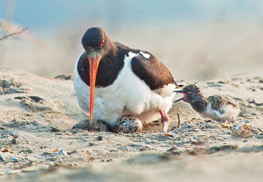 ○··· 밤에는 알이 식지 않도록 체온을 높여주고, 낮에는 복사열에 알이 상하지 않도록 그늘을 만들어 준다. 그 결과 3개의 알 중에 첫째와 둘째가 부화했고, 막내가 부화중이다. 이미 세상에 나온 첫째는 본능적으로 둥지를 떠나자고 엄마를 보챈다. 막내가 부화하면 검은머리물떼새의 둥지는 그 역할이 끝난다. 바로 둥지를 떠나 물가로 이동하기 때문에 둥지는 더 이상 보금자리가 아니다.