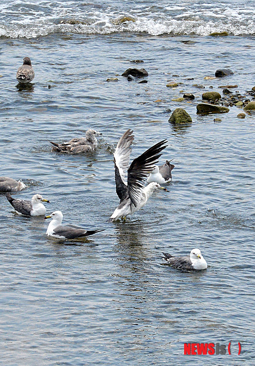○··· 【남해=뉴시스】차용현 기자 = 낮 최고기온이 29도를 웃돌며 후텁지근한 날씨를 보이고 있는 28일 오후 경남 남해군 이동면 화계마을 인근 바닷가에는 갈매기 20여 마리가 물장난을 하며 더위를 식히고 있다.