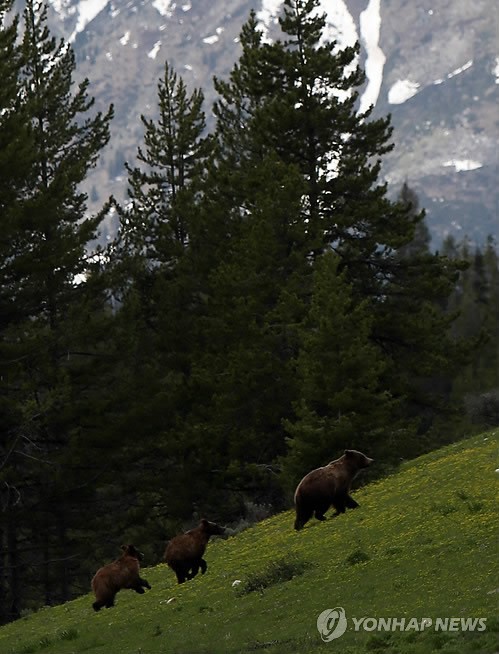 ○··· ( 모랜< 미 와이오밍주>=연합뉴스) 박창기 기자 = 겨울잠에서 깨어난 회색 야생 곰( 그레즐리, grizzly)이 29일 그랜드 티턴 국립공원에서 새끼 두마리와 함께 첫 봄나들이를 나섰다가 방향을 잃고 놀라 도망치고 있다. 2014. 5.29 changki @yna.co.kr