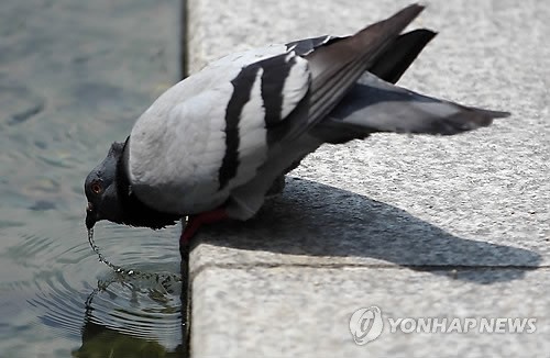 ○··· (서울=연합뉴스) 홍해인 기자 = 서울 낮기온이 29도까지 오르는 등 무더운 날씨를 보인 27일 오후 서울 청계천 광교 부근에서 비둘기 한 마리가 물 속에 머리를 담그기를 반복하고 있다.