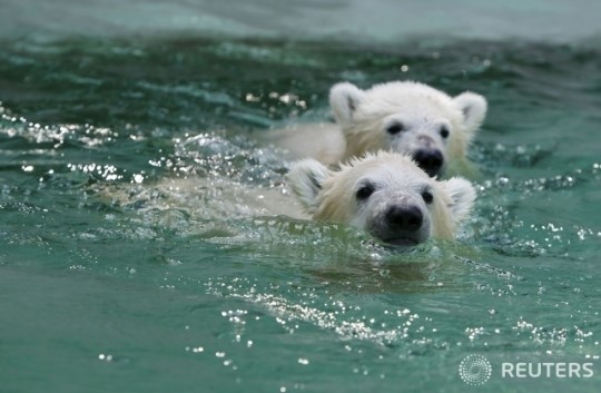 ○··· 26일(현지시간) 독일 뮌헨의 티에파크 헬라브룬 동물원에서 쌍둥이 북극곰 넬라, 노비가 물속에서 시간을 보내고 있다.