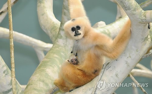 ○··· (AP/시카고동물협회=연합뉴스) 흰뺨긴팔원숭이 '인다'가 24일(현지시간) 미국 일리노이주 브룩필드 동물원에서 생후 2주된 새끼를 안고 있다. 흰뺨긴팔원숭이는 원산지인 베트남과 라오스에서는 멸종위기 상태에 있으며 중국에서는 이미 멸종된 것으로 알려지고 있다.