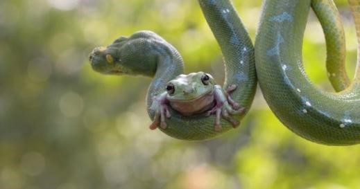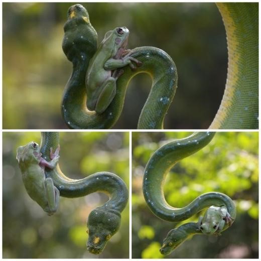 ○··· 길이 91㎝에 육박하는 대형 비단뱀의 등 위를 겁 없이 올라타고 있기 때문.이 개구리는 뱀의 온 몸 구석구석을 타고 여유롭게 이동하고 있다. 목 부분을 잡고 매달리기도 하고 위협적인 뱀 입 근처에서 한참 동안 머무르기도 한다.