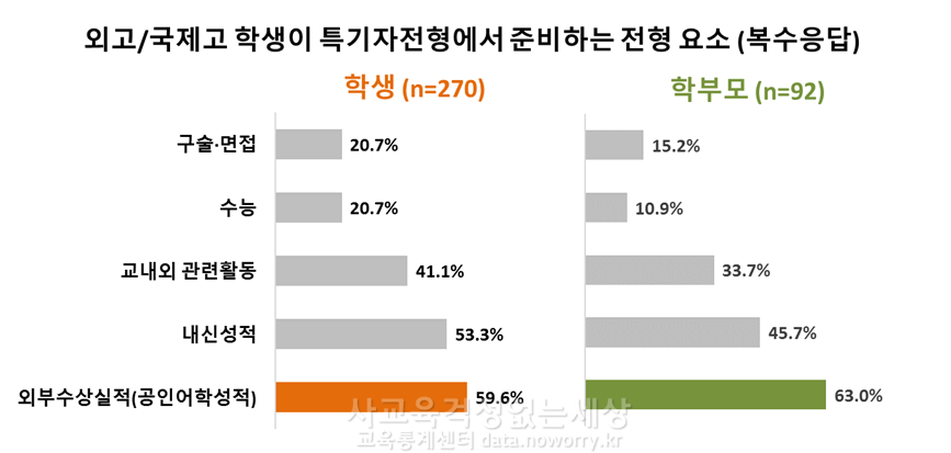 특기자전형을 준비하기 위해 대비하고 있는 전형 요소를 살펴보면 학교교육 정상화와 괴리가 큽니다. 해당 전형을 준비하는 학생의 가장 많은 고교 유형은 과고·영재고이며 다음은 외고·국제고입니다. 과고·영재고 학생들은 특기자전형을 준비하면서 대학별고사인 구술면접을, 외고·국제고 학생들은 외부수상실적과 공인어학성적을 가장 많이 준비하는 전형요소라고 응답했습니다. 이는 학교 교육과정으로 대비하기 어려운 요소들입니다. 따라서 특정 학교로 지원자가 몰리고 학교 교육과정으로 대비할 수 없는 전형 요소가 많은 특기자전형(수학/과학/어학)은 폐지해야 할 것입니다.