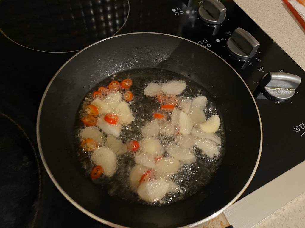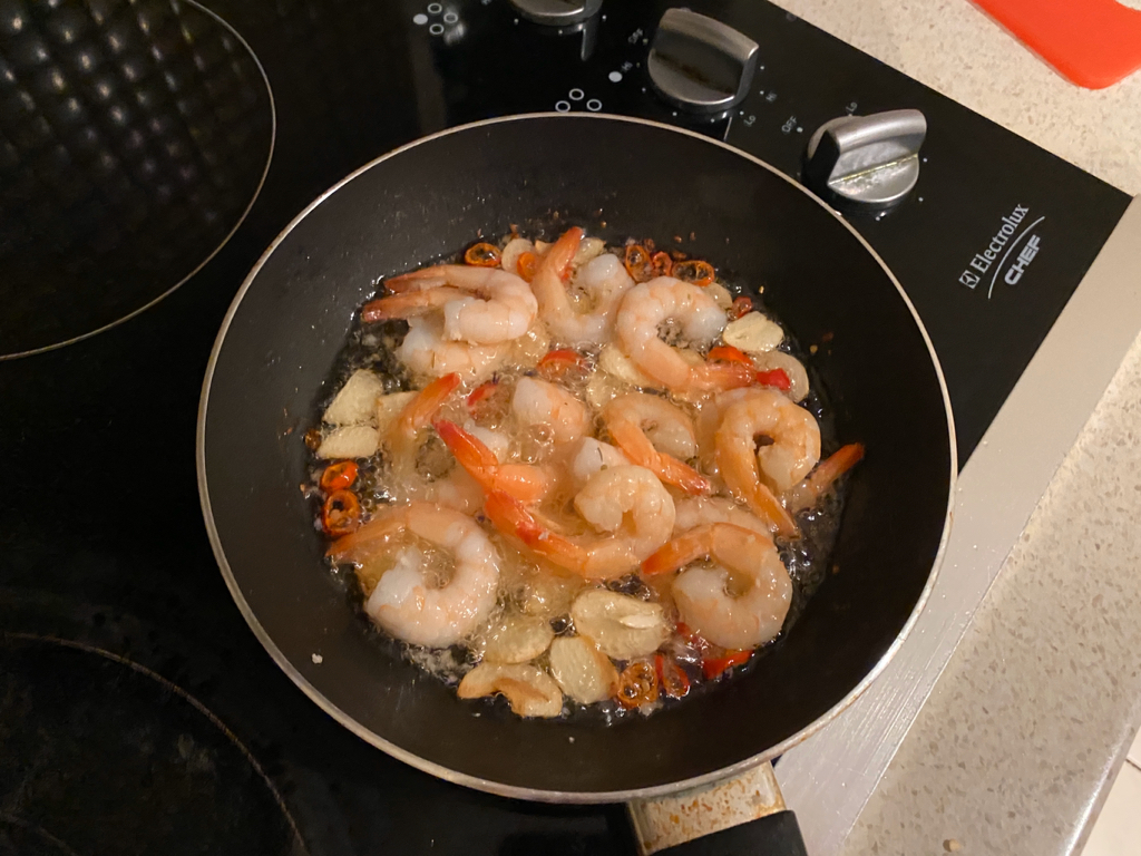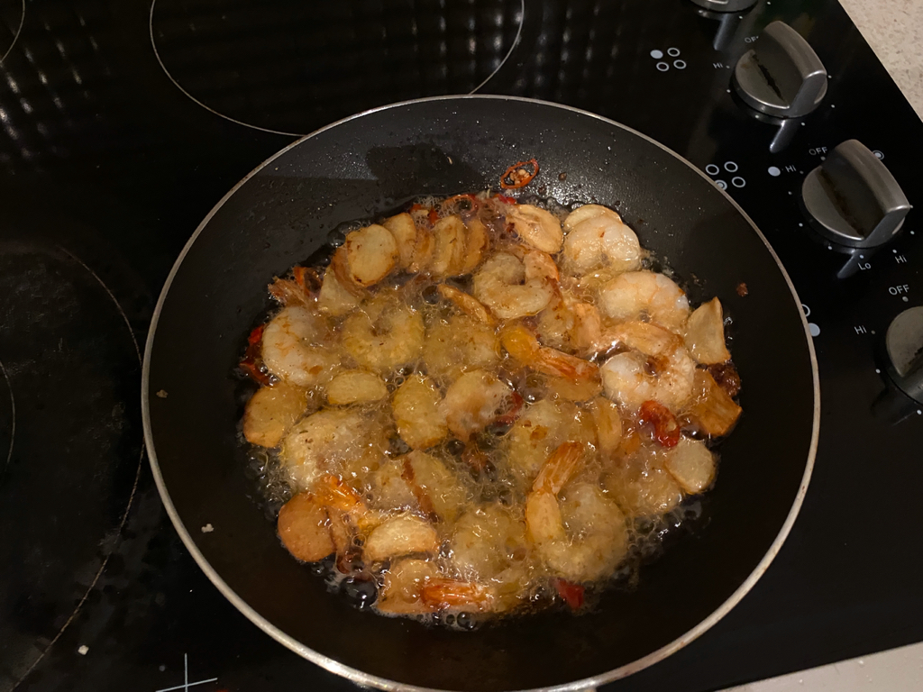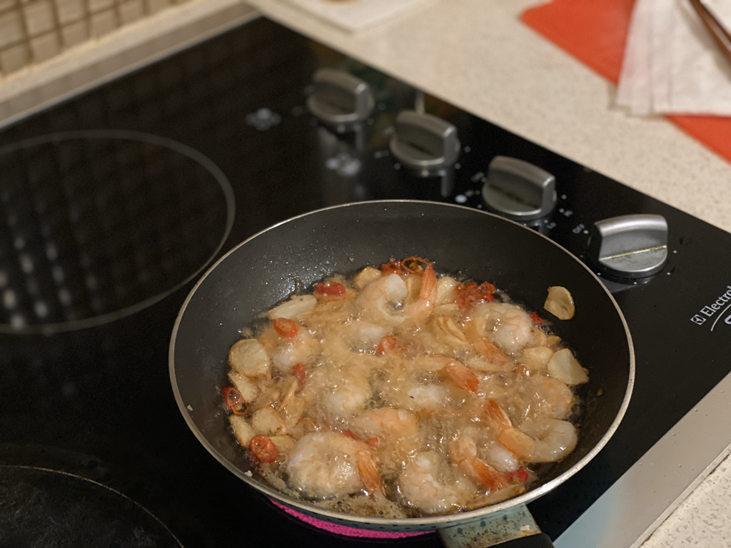 그리고 마늘이 색이 변하면 그 때 새우를 넣어줘
