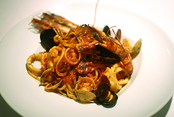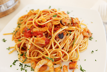 토마토소스와 잘 어울리는 해산물을 주재료로 만든 스파게티 |