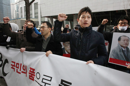 | 김재철 MBC 사장 퇴진 총파업 중인 MBC 노조의 김정근(오른쪽) 아나운서.