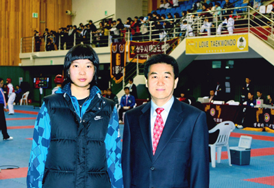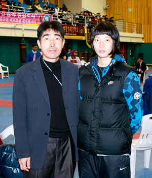 | ▲ 강동규 코치와 나란히 선 강보현 | 지난 4월 25일 오전 경북소년체전 태권도 경기가 열리고 있는 영천 태권도 전용체육관 최무선관에 2010년 국가대표로 선발된 강보현(한국체육대)이 찾아와 경북태권도협회 임원과 지도자, 후배 선수들의 따뜻한 환영을 받았다.