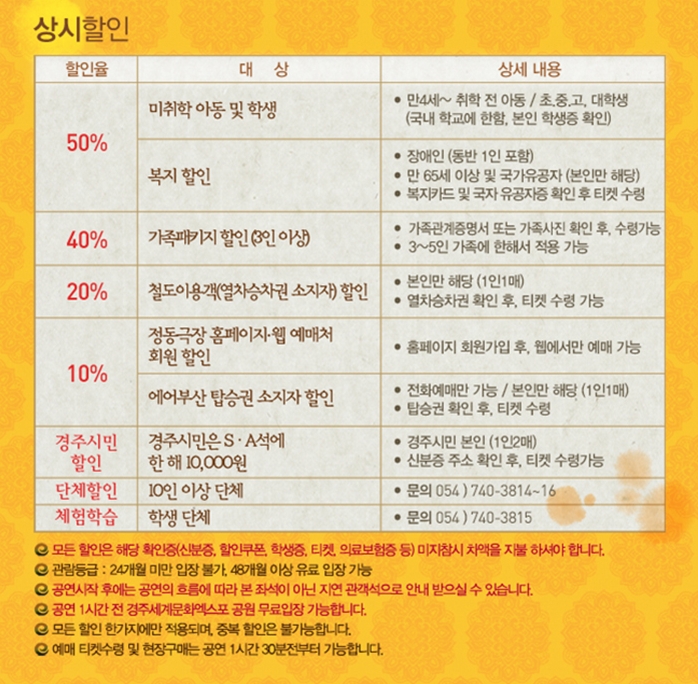 경주시민할인 및 아동, 학생, 복지할인등 상시할인 이용하여 보다 알뜰히 공연 보시면 더 좋겠죠?^^