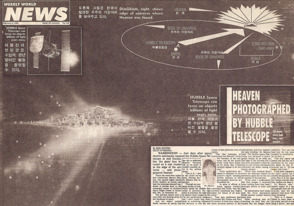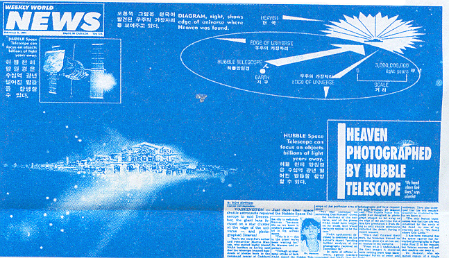 허블(Hubble) 망원경에 촬영되다 ! 지난 12월 중순 허블 천체 망원경이 우주 비행사들에 의해 보수되고 난 후 몇일 되지 않아 우주의 끝머리인 가장 자리에서 일련의 성군이 그 망원경에 의해 포착되었다. 촬영된 그 부분은 바로 “천국”이었다. 수 백장의 사진들이 그 망원경에 의해 촬영되어 지난 12월 26일 메릴랜드의 Goddard 우주 비행 센터의 총사령실로 전송된 사실이 밝혀졌다. 이 내용은 나사 (NASA)의 관리자들의 말을 인용 보도한 Marcia Masson 박사에 의해 공개됐다. 그 사진들은 우주 공간에 찬란히 빛나는 거대한 도성의 모습을 확실히 보여주고 있다. 그리고 나사(NASA:미항공우주국)는 그 도성은 분명히 “천국” 이라고 밝히고 있다. 왜냐하면 끝없는 우주공간에 그러한 것이 존재한다는 것이 불가사의하기 때문이다. “이것이 바로 우리가 기다려온 것이다” “나사는 허블 천체 망원경으로 우주 공간을 탐사 하던중 바로 이 천국의 모습을 촬영해 낸 것이다. 나는 신앙이 없는 사람이지만 그 망원경이 우주의 특정한 곳을 포착할 수 있도록 영향을 끼친 그 무엇이 있음을 부인할 수 없다” “그분이 바로 하나님이 아니실까?”