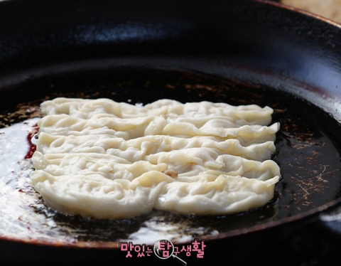 손님이 떡볶이와 만두를 주문을 하면, 만두는 기름을 넉넉하게 두르고 튀기듯 만들어 줍니다.