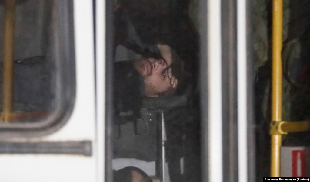 러시아 국방부가 공개한 영상에는 부상당한 우크라이나 군인이 아조우스탈 제철소에서 대피한 후 버스에서 치료를 받는 모습을 보여준다.
