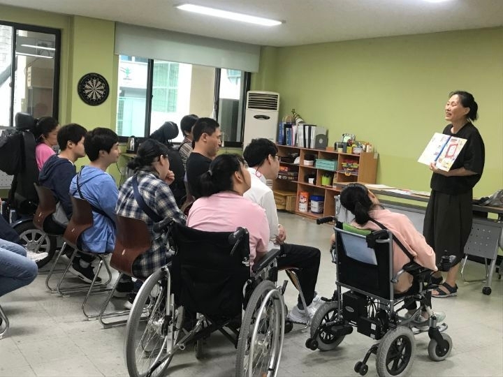 겨울 졸업이야기에서 주인공이 경사로와 장애인 화장실을 눈여겨본 이야기를 하시며 주인공이 휠체어를 타고있다고 설명해주었습니다.