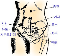 혈 자 리 : 배꼽에서 아래쪽으로 1치 5푼을 내려간 곳에 있다.