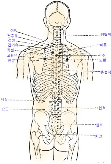 혈 잡 기 : 환자를 바로 앉게 하거나 엎드리게 하고 세 번째 가슴등뼈 밑에 있는 신주혈에서 옆으로 1치 5푼 되는 곳에서 잡는다.