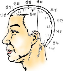 혈 잡 기 : 양쪽 귀를 앞으로 접고 양쪽 귀 끝을 연결하는 선과 머리 한가운데를 가르는 선이 교차되는 곳, 앞 머리털이 나기 시작한 곳에서 5치를 올라가 잡는다.