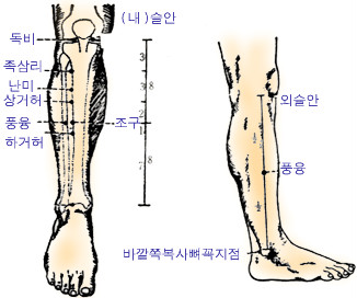 혈 자 리 : 돌비혈에서 아래로 3치 내려가, 다시 굵은 정강이뼈 바깥쪽으로 1치를 나가 굵은 정강이뼈와 가는 정강이뼈 사이에 있다.