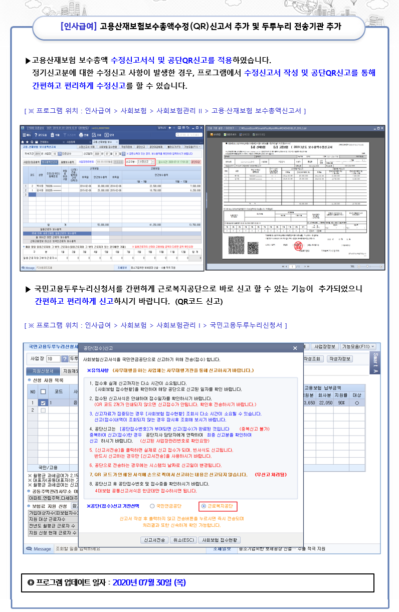 ⊙ 고용산재 더존 - 고용산재보험보수총액수정(QR) 신고서 추가 및 두루누리 전송기관 추가