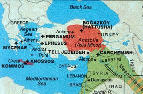 헷족속이 고고학적으로 발굴됨에 따라서 힛타이트 문명권이 규명되었는데, 위 그림를 보면 터키 지도가 있습니다. 붉은 색을 칠해놓은 이곳이 힛타이트의 중심부 입니다. 힛타이트의 수도는 '핫투사'인데 터키의 현재 수도인 앙카라에서 동쪽으로 위치하고 있습니다. 핫투사를 수도로 해서 터키를 중심으로 메소포타미아(비옥한 초생달) 전체를 지배하고 심지어는 이집트까지도 점령하여 대제국을 형성했다는 것이 밝혀지게 되었습니다.