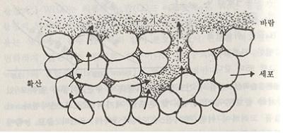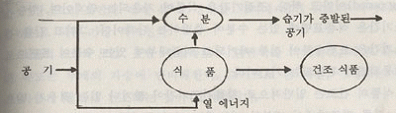 ○ 등온흡습곡선 : 식품의 건조상태는 식품속의 수분, 식품과 접하고 있는 공기의 습도(수증기 분압) 및 온도의 세가지 요소가 관여한다. 이 요소들을 고려하여 어떤 주어진 온도에서 x축에 공기의 습도, y축에 식품의 수분함량을 표시하여 이 관계를 나타낸 곡선을 등온흡습곡선 (sorption isotherm curve)이라고 한다. 이 등온흡습곡선은 식품의 등온흡습곡선들이며 식품의 평형수분함량(EMC)은 식품의 종류에 따라 그 값이 다르지만 일반적으로 상대습도(RH) 60 ` 80% 부근에서 비교적 큰 값을 보인다. 이것은 흡습성이 높은 단백질, 전분 등을 많이 포함하고 있기 때문이다. ○ 채소, 과실로 부터의 수분증산기구 : 과실, 채소류는 표피계 조직의 효과가 없는 수분증산이 일어난다. 그러므로 건조품을 만드는 경우 전처리를 해서 증산을 촉진토록 한다는 것과 박피를 한다든가 알카리액처리를 한다는 것이다. 표피를 제거한 후 조직중의 수분을 어떻게 증산하는 가는 그림에서와 같다.