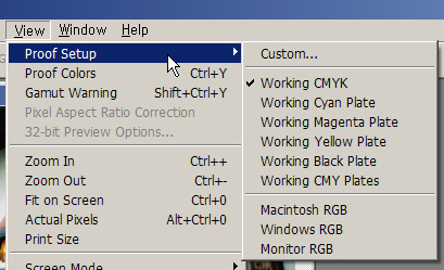 1. Proof Setup : 가상으로 인쇄 색상을 동작할 색상 모드를 선택합니다. Working CMYK로 선택하면 CMYK 인쇄 색상으로 인쇄 하였을 때 현재 이미지가 어떠한 색상으로 인쇄될지 확인할 수 있습니다. 또한 각가의 채널별로 선택하여 인쇄시 색상을 확인할 수 있습니다.
