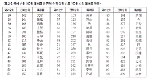 초등학교 국어 교과서 漢字語 총수는 6,389개로 상위 빈도 100위 안의 漢字語 목록은 다음 <표 2-4>와 같다.