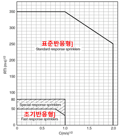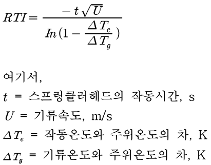 위의 식을 통해 결론적으로 정의하면, 스프링클러는 RTI 작을수록, 기류속도가 빠를수록, 고온가스와 용융체의 온도차가 클수록 작동시간이 빨라지며, 그 중에서 스프링클러만이 가지는 고유값은 RTI만 해당됩니다.