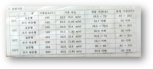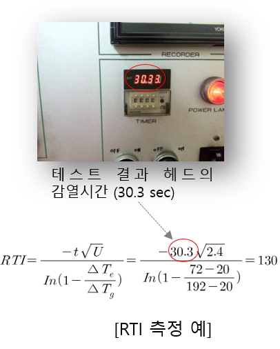 만일 위의 사진과 같이 작동(감열)시간이 30.3초 였다면 위의 공식에 넣어서 계산하면 130이 나오게 된다. 표준반응형의 경우 RTI값의 범위가 80 ~ 350으로 규정하고 있으므로, 위의 스프링클러는 표준반응형 스프링클러의 적정범위내에 들어간다고 볼 수 있습니다.