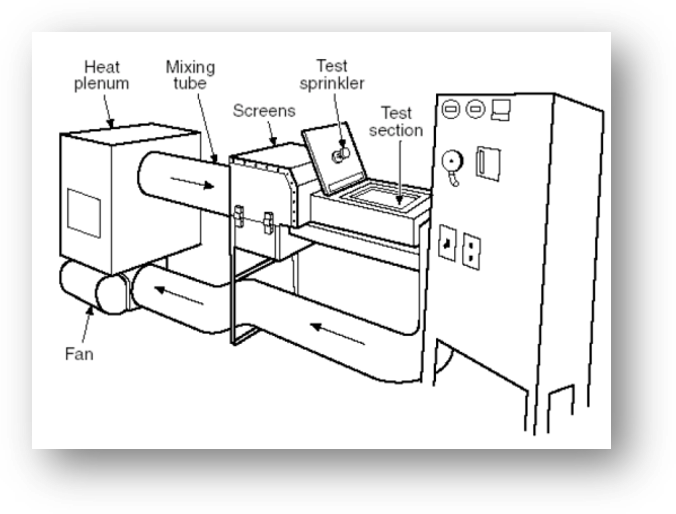 스프링클러의 RTI를 측정하는 방법은 상기 그림과 같은 시험기구내에, 뜨거운 공기를 순환시키는 상태에서 스프링클러를 집어넣어 작동하는 시간을 측정하여 계산을 합니다. 두가지 방법이 있는데, 하나는 공기의 온도를 일정한 비율로 상승시키는 상태에서 측정하는 경우와 두번째는 공기온도를 일정한 상태로 유지한채 스프링클러를 집어넣어 작동시간을 측정하는 방식입니다.