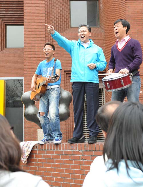 ★...22일 오후 제18대 총선 서울 종로에 출마한 박진 의원이 대학로 마로니에 공원을 찾아 거리 예술가들과 노래를 부르고 있다./뉴시스 ▒▒☞[출처]조선일보 |