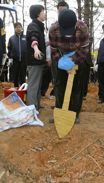 ★...22일 오후 안양 초등학생 살해사건의 용의자 정 모 씨가 경기 수원 호매실동 야산에서 故 이혜진양의 시신을 암매장하는 현장검증을 실시하고 있다./뉴시스