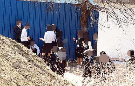 ★...충남 논산의 모 고등학교가 교내에 학생들의 흡연구역을 사실상 묵인.방치해 물의를 빚고 있다. 사진은 지난 18일 흡연구역에 모인 학생들이 담배를 피우고 있는 모습. << 네티즌 제공 >>/연합뉴스 ▒▒☞[출처]조선일보 |