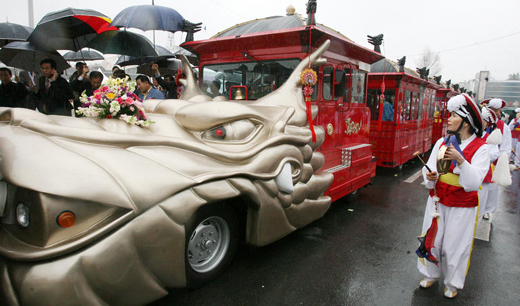 ★...23일 오후 경기도 수원 화성행궁 앞에서 세계문화유산인 수원 화성(華城)을 찾는 국내외 관광객들에게 화성의 아름다움을 선보일 화성열차 3호 발대식이 열려 방풍 편의성과 장애인석을 갖춘 열차가 멋진 자태를 선보이고 있다. 화성열차 3호는 길이 23m, 폭 2.3m의 무궤도 차량으로 49명이 탑승할 수 있다./연합뉴스 ▒▒☞[출처]조선일보 |