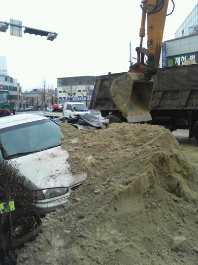 ★...23일 오전 10시25분께 충북 제천시 영천동 역전오거리에서 화산동 방면으로 좌회전하던 덤프트럭(운전자 장모씨.51)이 옆으로 넘어져 10여t의 흙이 쏟아지면서 길가에 주차돼 있던 승용차 2대가 흙에 묻혔다. 사고당시 승용차 안에는 사람이 없어 인명피해가 발생하지는 않았다. 경찰 등은 중장비를 동원해 쏟아져 내린 흙을 2시간 동안 치웠다. 경찰은 운전자 장씨가 운전부주의로 사고를 낸 것으로 보고 정확한 사고경위를 조사 중이다./뉴시스 ▒▒☞[출처]조선일보 |