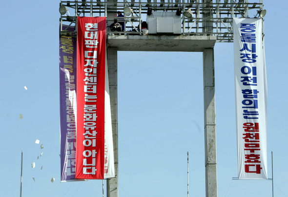 ☞ 풍물시장 이전 반대 ‘고공 시위’