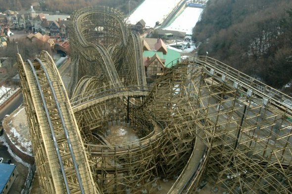 ★...경기도 용인시에 위치한 에버랜드가 지난 14일 야심차게 오픈한 나무로 만든 롤러코스터 'T 익스프레스' 가 가동 9일만인 22일 오후 승객들을 태운채 멈춰서는 사고가 발생했다. 이 사고로 다행히 인명피해는 없었으나 승객들이 지상 40여m의 경사진 레일에 매달린 롤러코스터 탑승차안에서 10분간 공포에 떨어야 했다. ▒▒☞[출처]한겨레 |