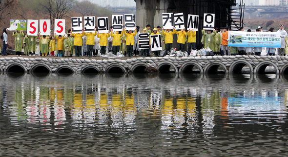 ★...23일 오전 서울 송파구와 경기 성남 경계인 탄천에서 강동송파환경운동연합과 성남환경운동연합 주최로 탄천살리기 행사가 열렸다. 이날 행사에 참가한 학생들과 시민들이 하천 정화활동을 한 뒤 탄전 보전을 위한 행위극을 하고 있다. 이종근 기자 ▒▒☞[출처]한겨레 |