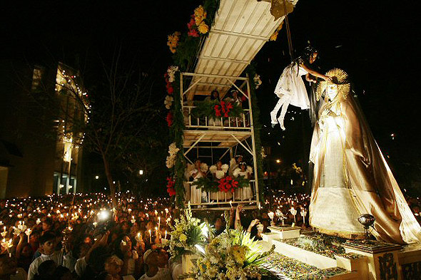 ★...천사처럼 차려입은 한 젊은 필리핀 여성이 23일 마닐라 북쪽 케손 시티 근교의 산토 도밍고 교회에서 부활절 의식중 한 다리위에서 늘어뜨린 밧줄에 매달린채 성모 마리아 상의 베일을 벗기고 있다. 마닐라/ㅂAP 연합 ▒▒☞[출처]한겨레 |