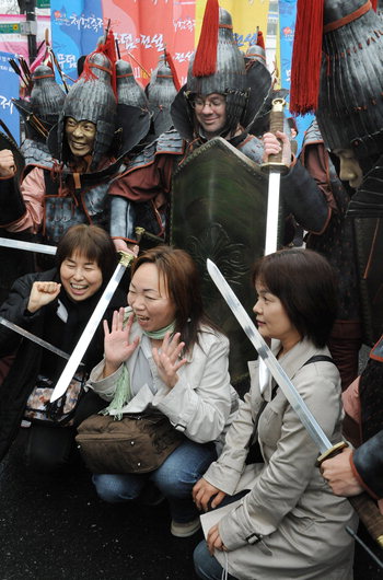 ★...서울 인사동 거리에서 23일 열린 ‘대가야 체험 축제’ 홍보 행사에서 외국인 관광객과 시민들이 철갑병사가 행인을 위협하는 장면을 연출하고 있다. 축제는 경북 고령에서 다음달 11일부터 열린다.〈 김영민기자 〉 ▒▒☞[출처]경향신문 |